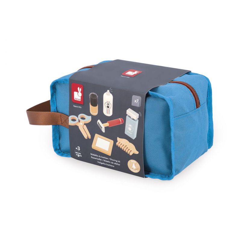 ¡Todo lo necesario para afeitarse y ponerse guapo! ¡7 accesorios de madera: una brocha de afeitar y su espuma de afeitar para la cara, una cuchilla de afeitar, un peine para el pelo, unas tijeras para recortar, un espejo para admirarte y un perfume para el toque final!