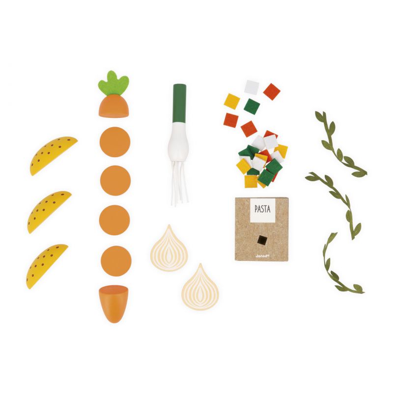 Este set está compuesto por 43 accesorios: una olla y un cazo de metal, una batidora para batir las verduras, 6 trozos de zanahoria, 2 cebollas, 3 trozos de patata y un puerro de madera, 3 ramitas de hierbas aromáticas de tela y 24 trocitos de pasta de colores guardados en su caja de cartón.